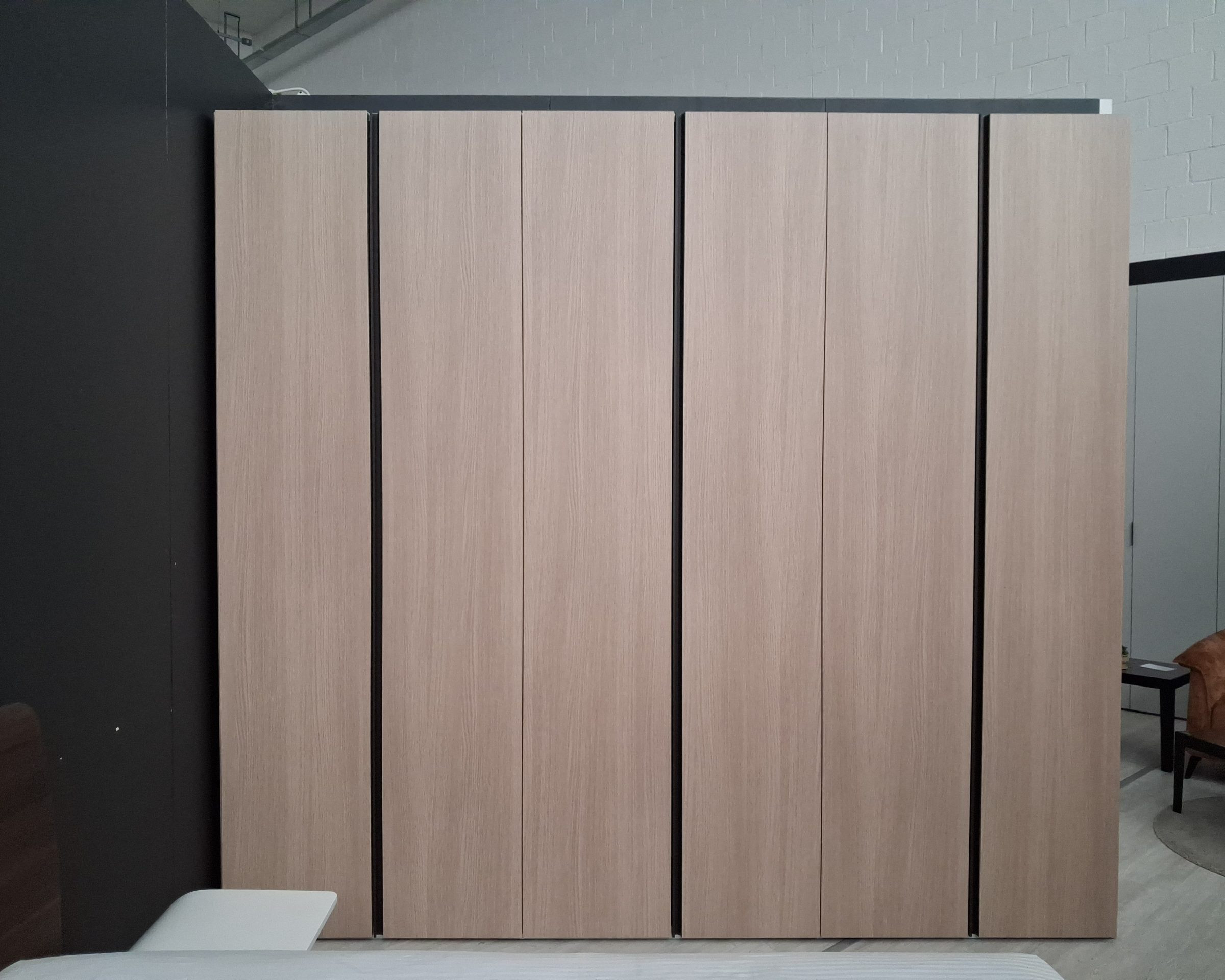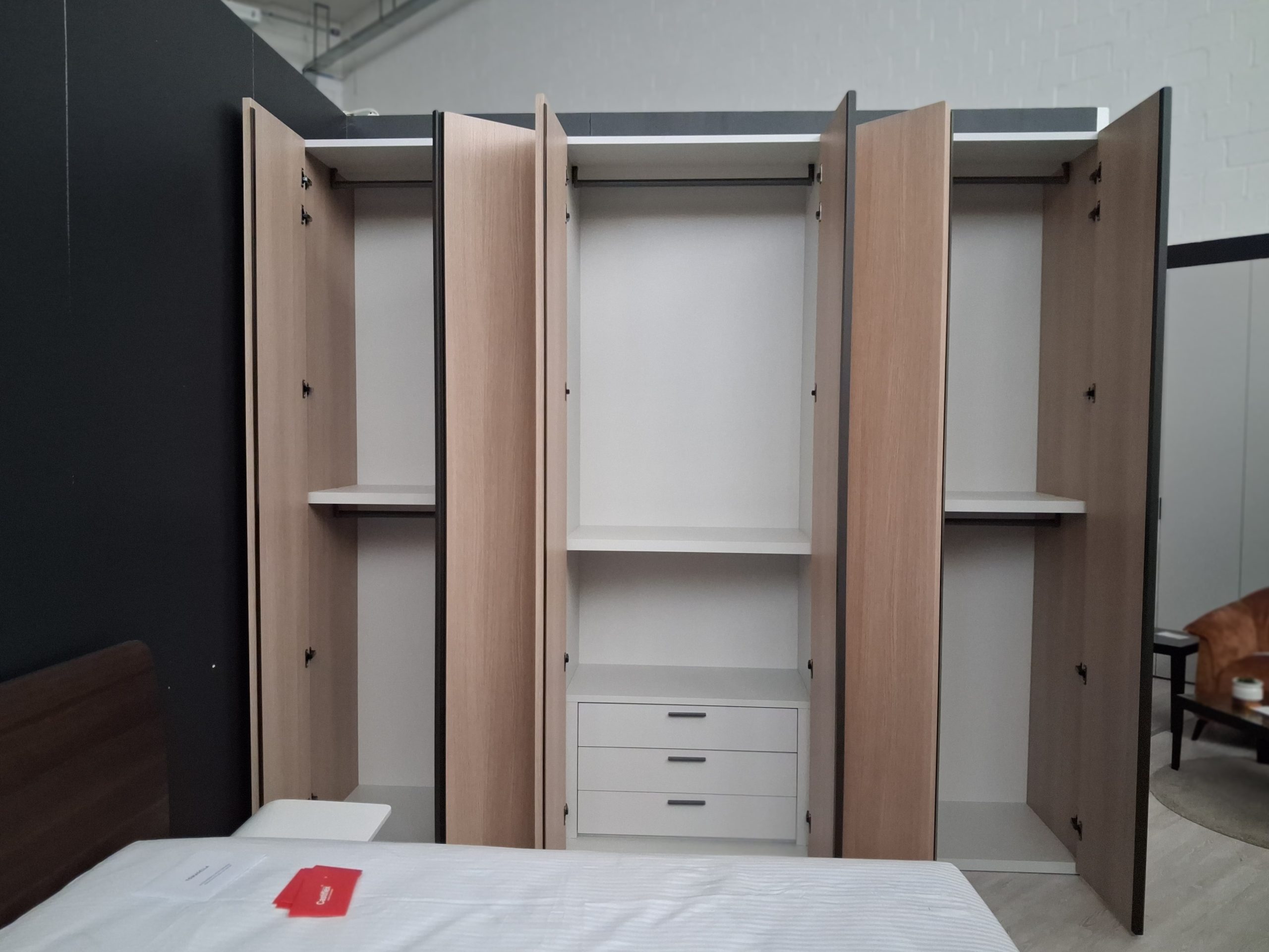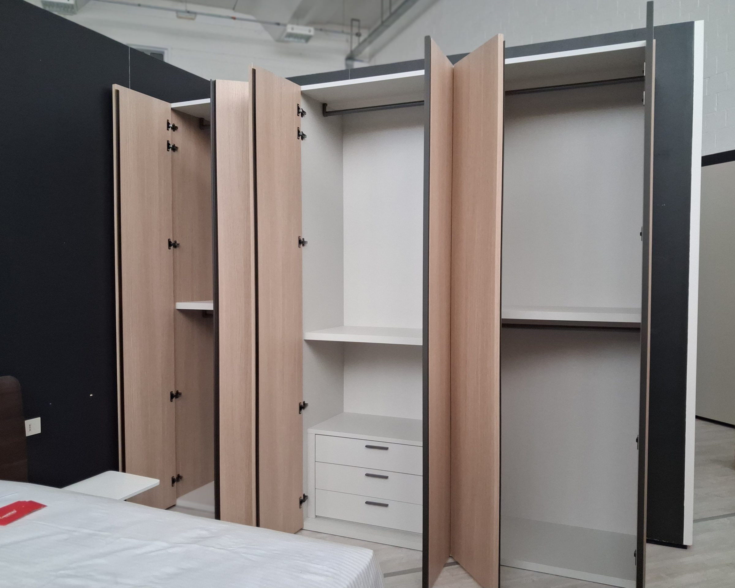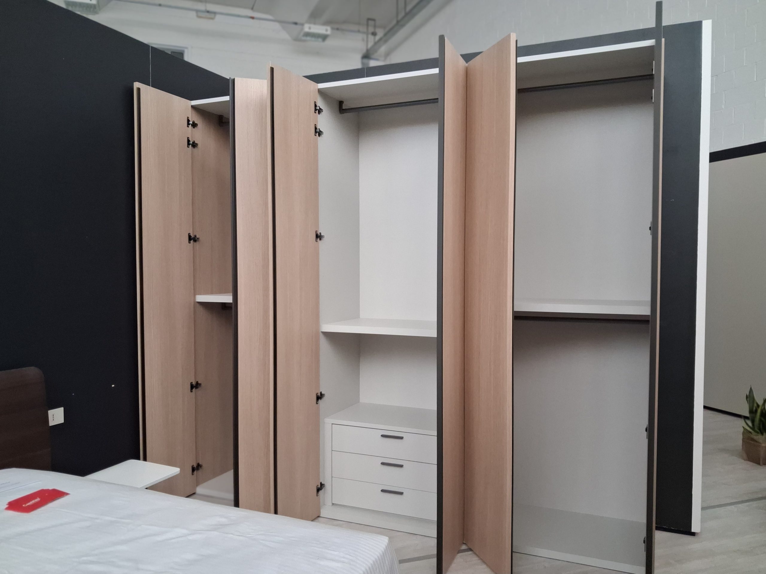 Accessoriato con ripiani, barre appendiabiti e cassettiera; Finitura Rovere sabbia