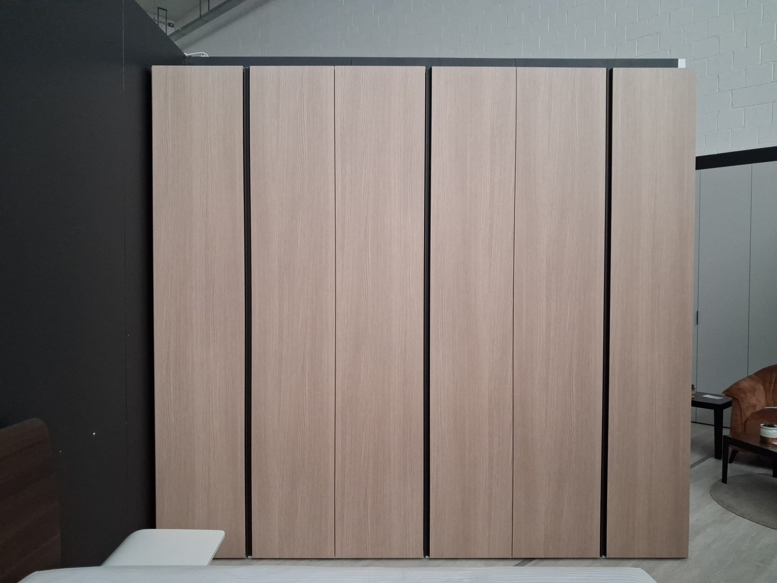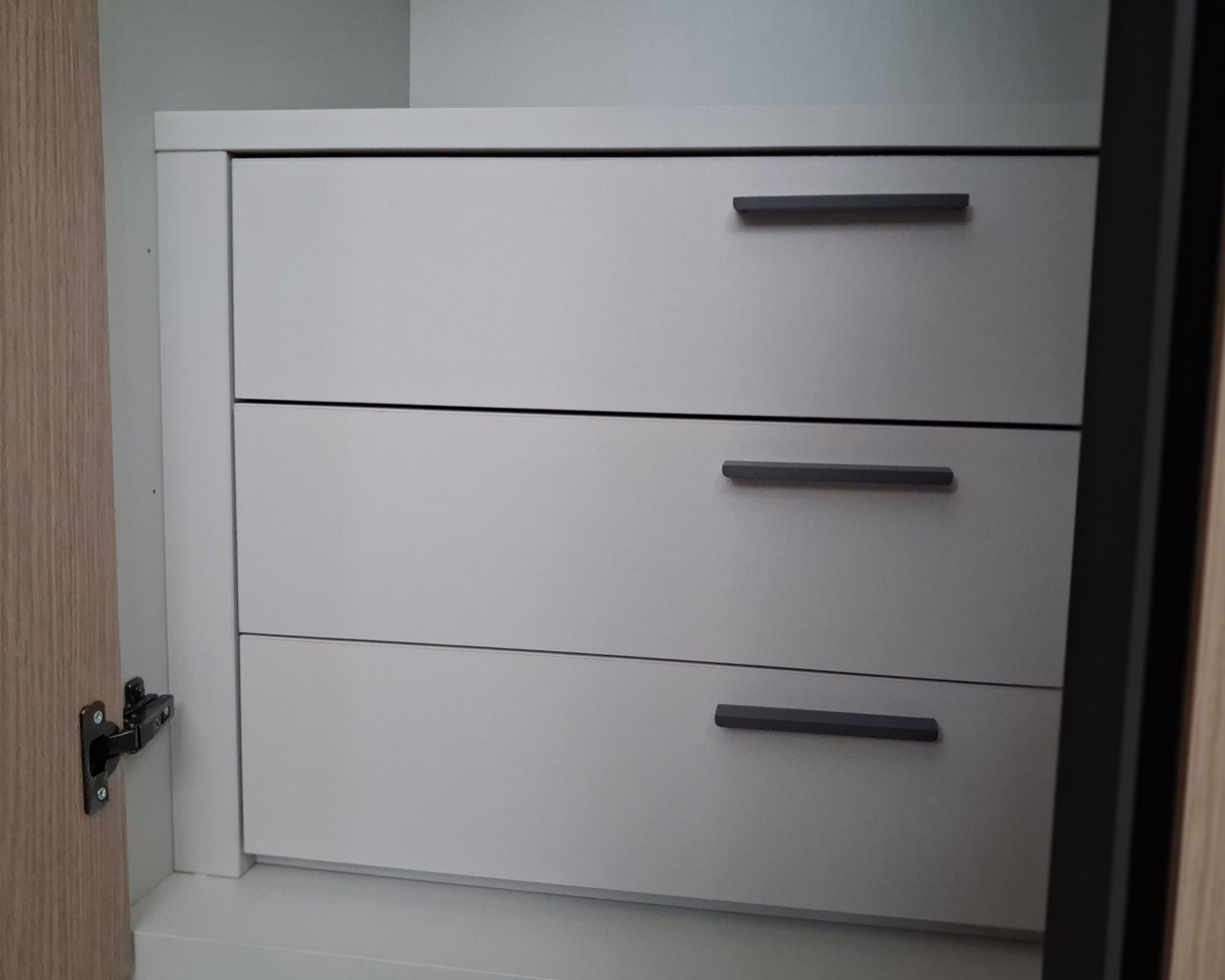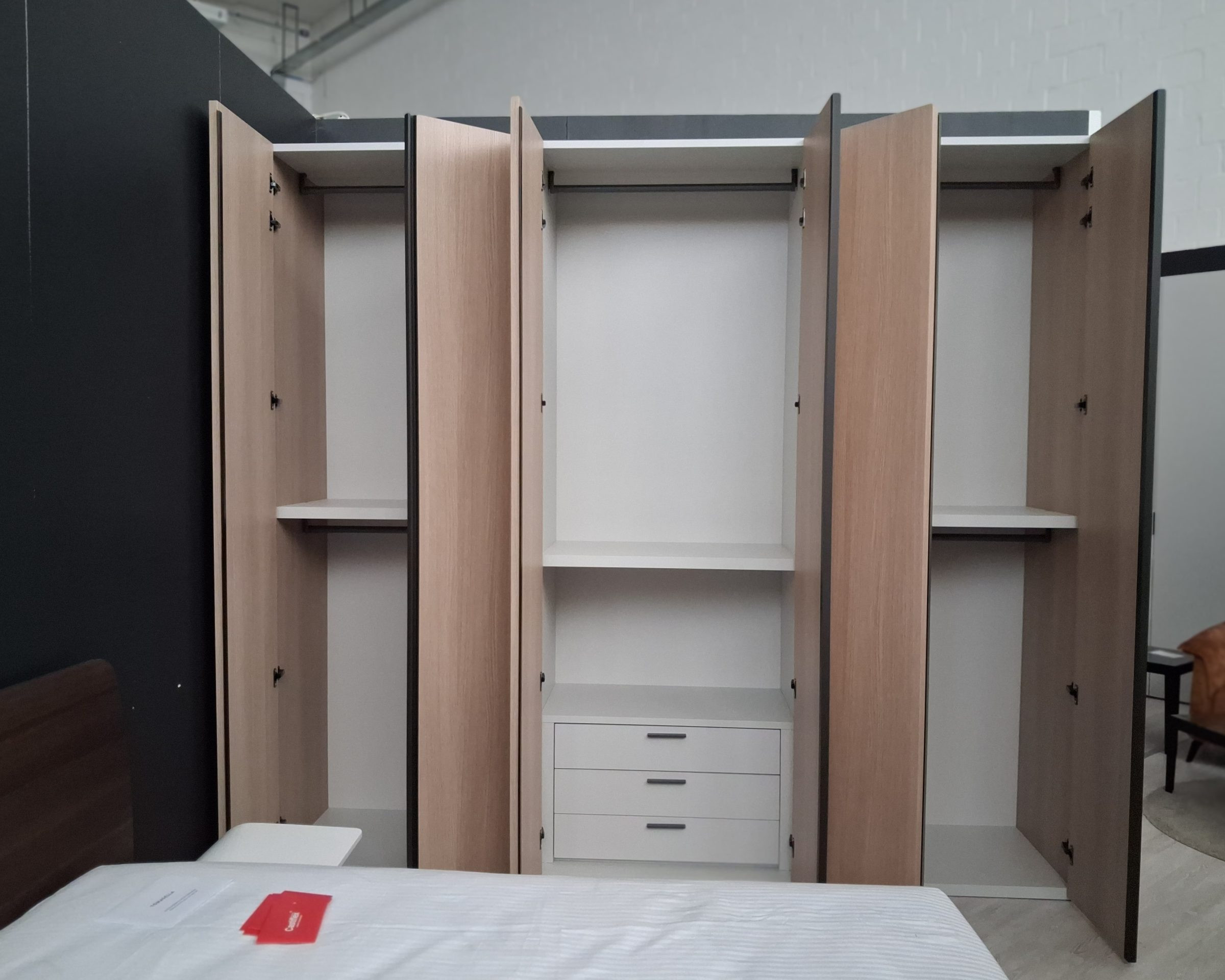Accessoriato con ripiani, barre appendiabiti e cassettiera; Finitura Rovere sabbia