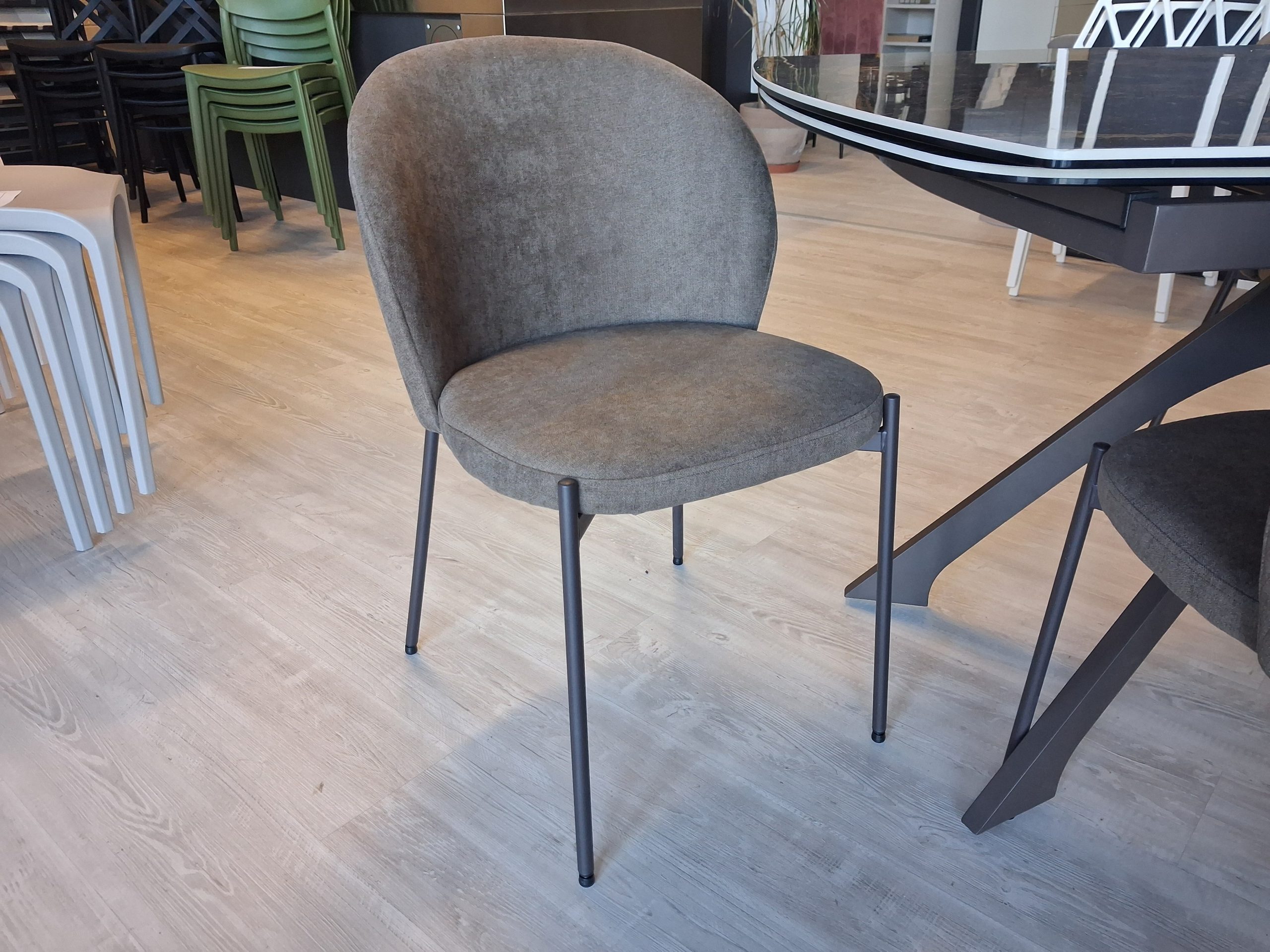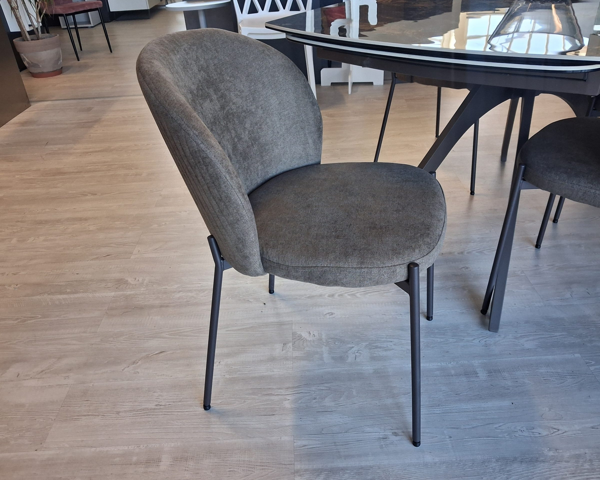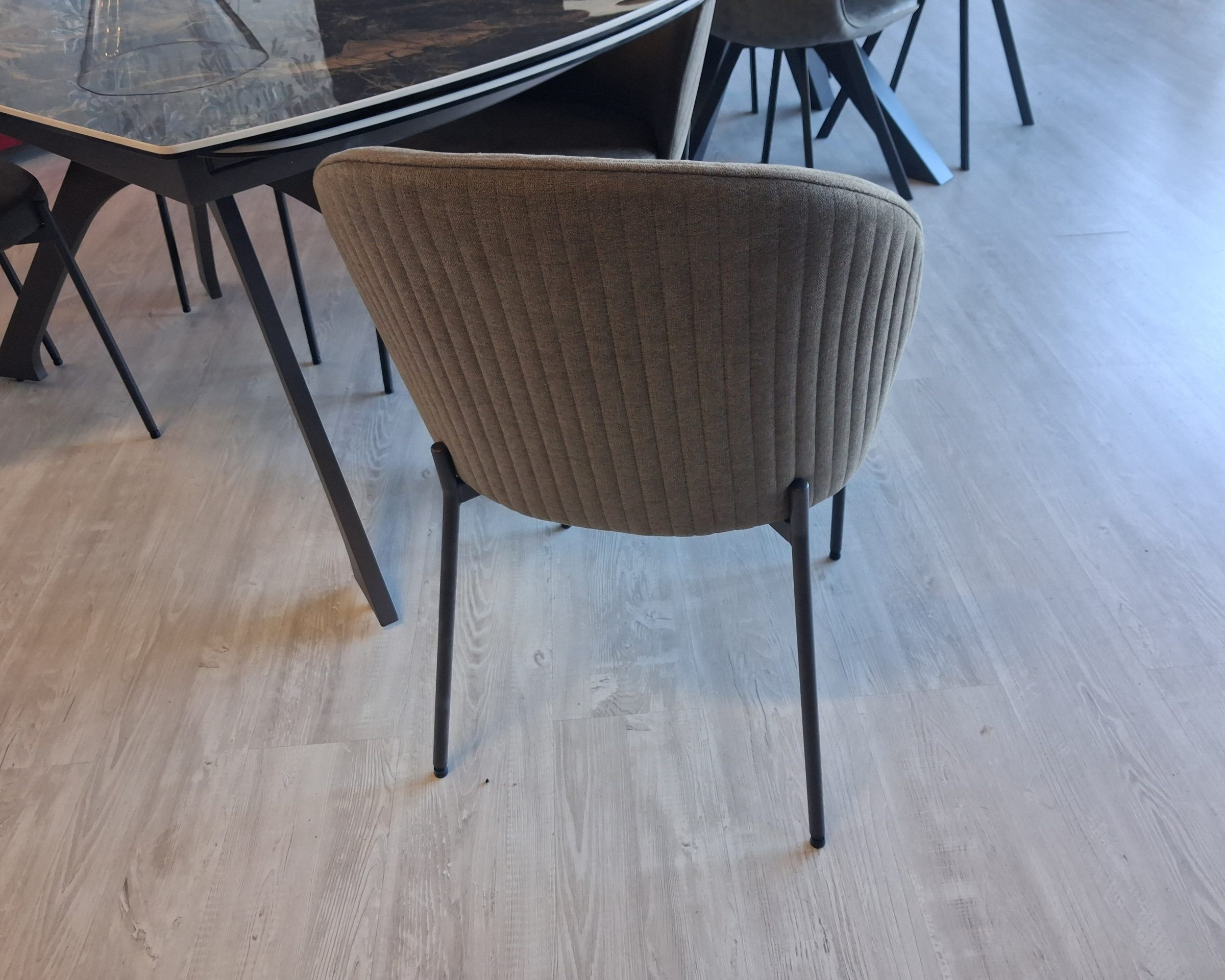 Sedia MEGGIE imbottita in tessuto, liscia sul fronte e sullo schienale lavorazione impunturata a righe. Struttura in metallo verniciato. Finitura Marrone.