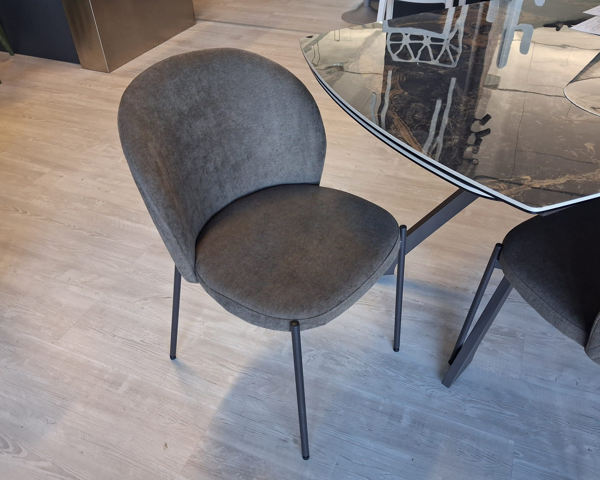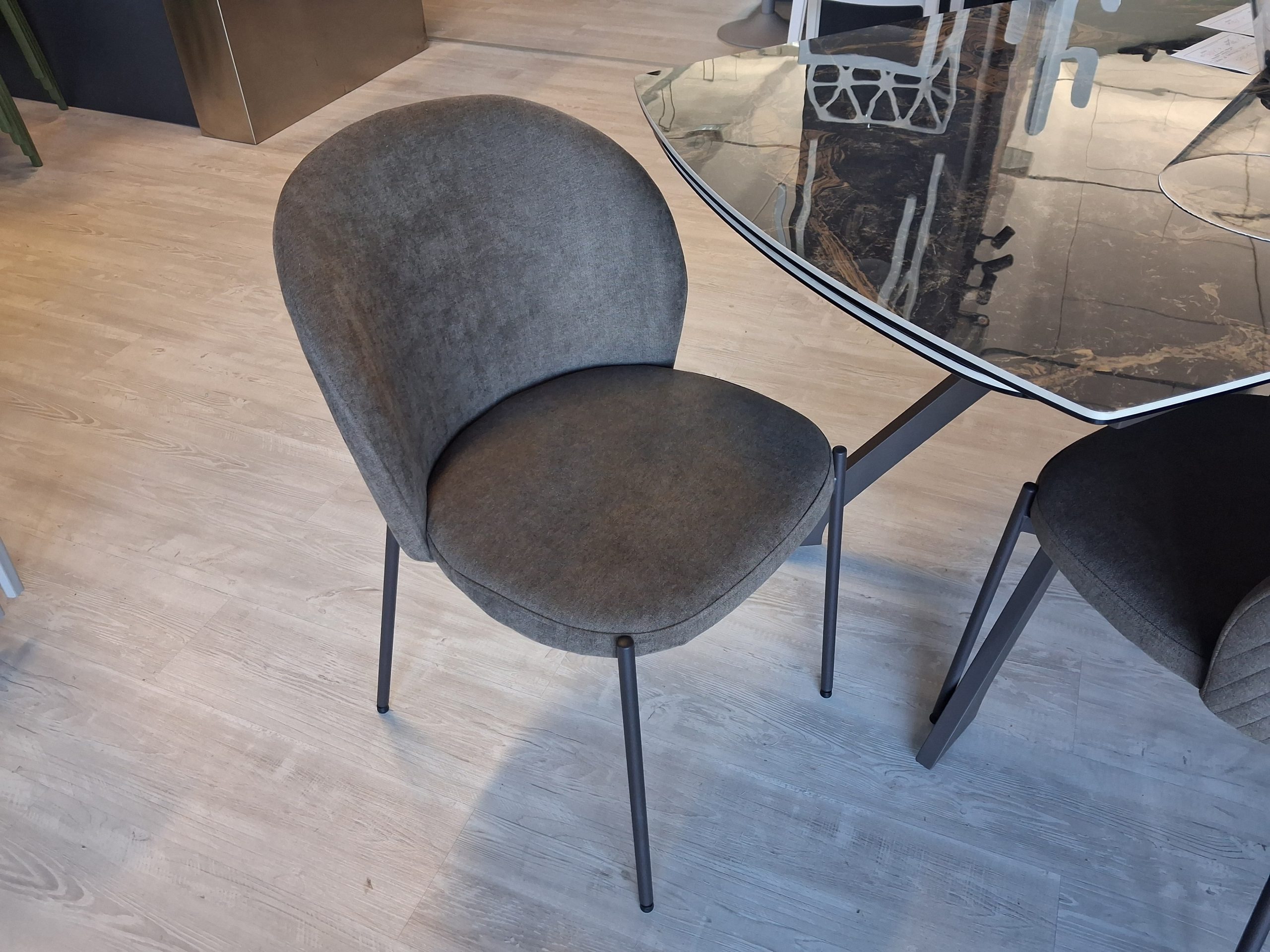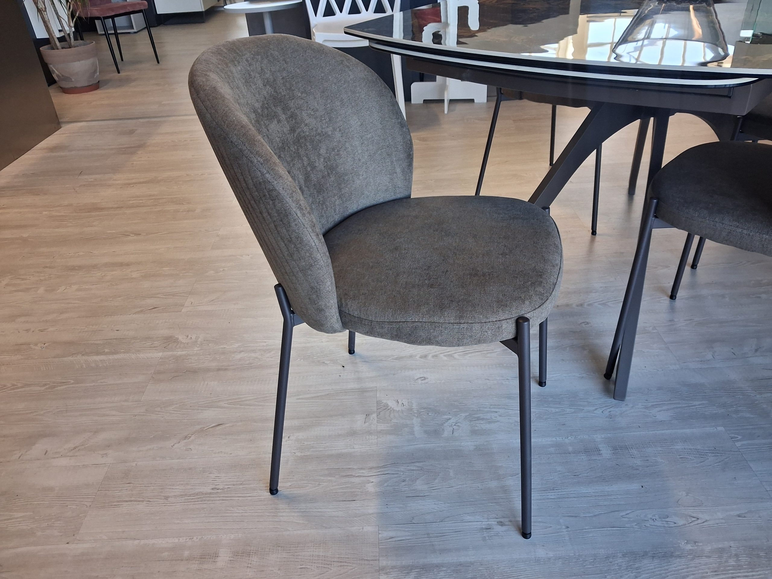 Sedia MEGGIE imbottita in tessuto, liscia sul fronte e sullo schienale lavorazione impunturata a righe. Struttura in metallo verniciato. Finitura Marrone.