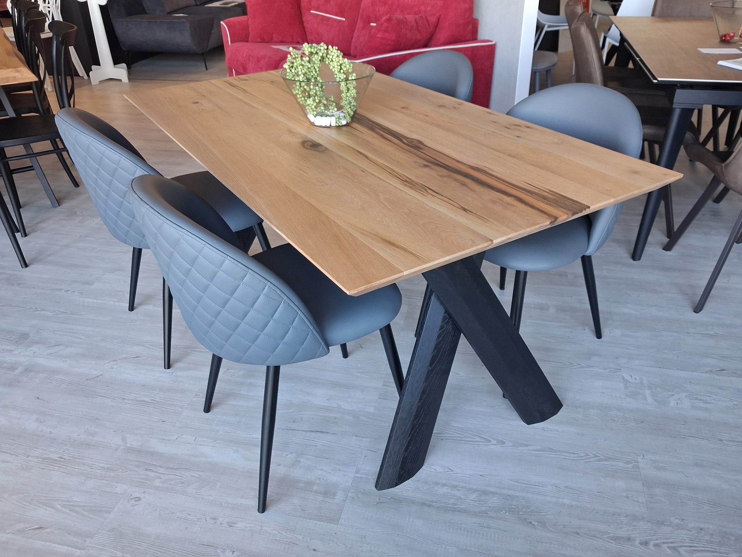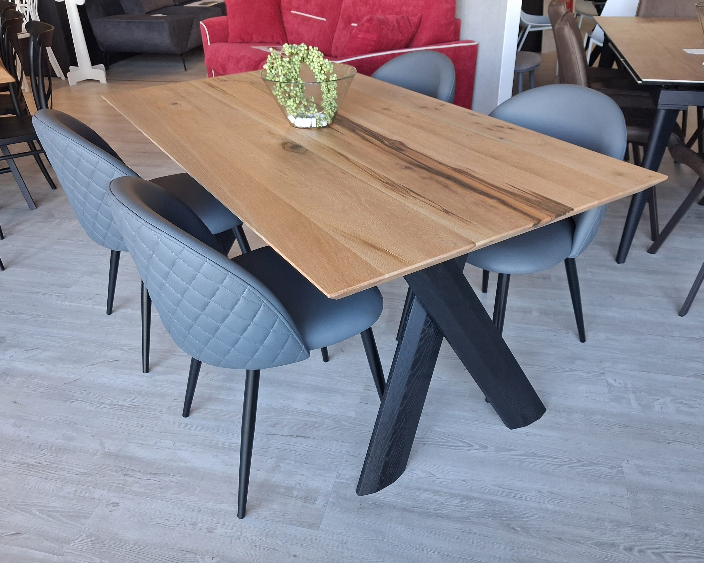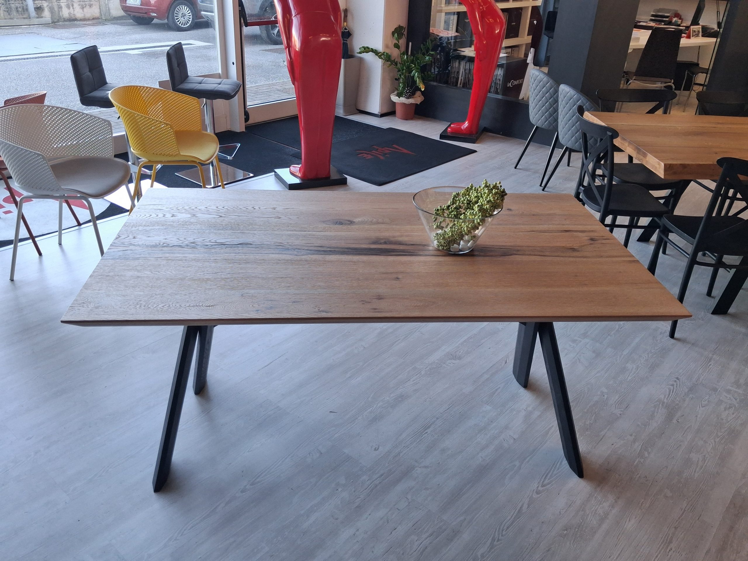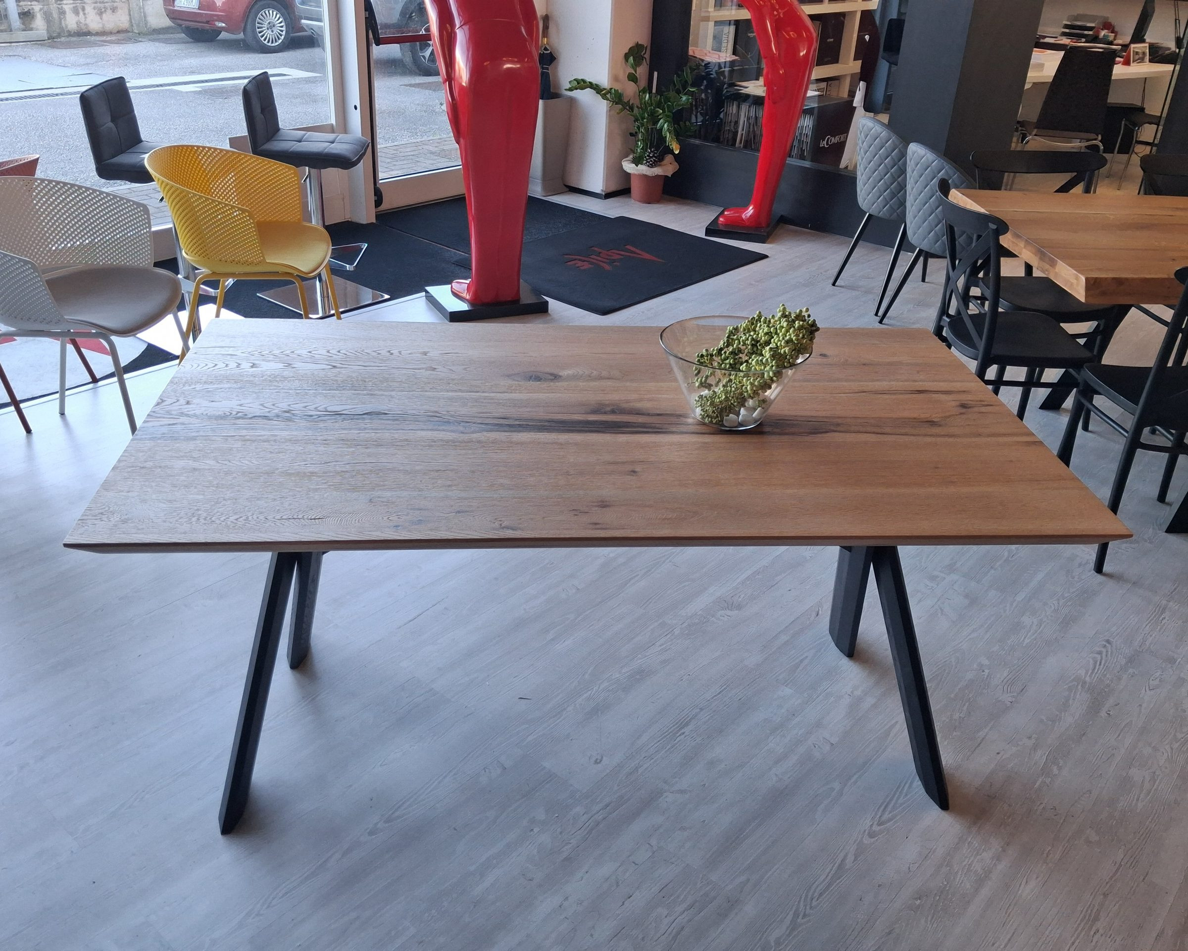 Tavolo Pechino con struttura di sostegno gambe in legno laccate nere e piano in legno di rovere invecchiato naturale.