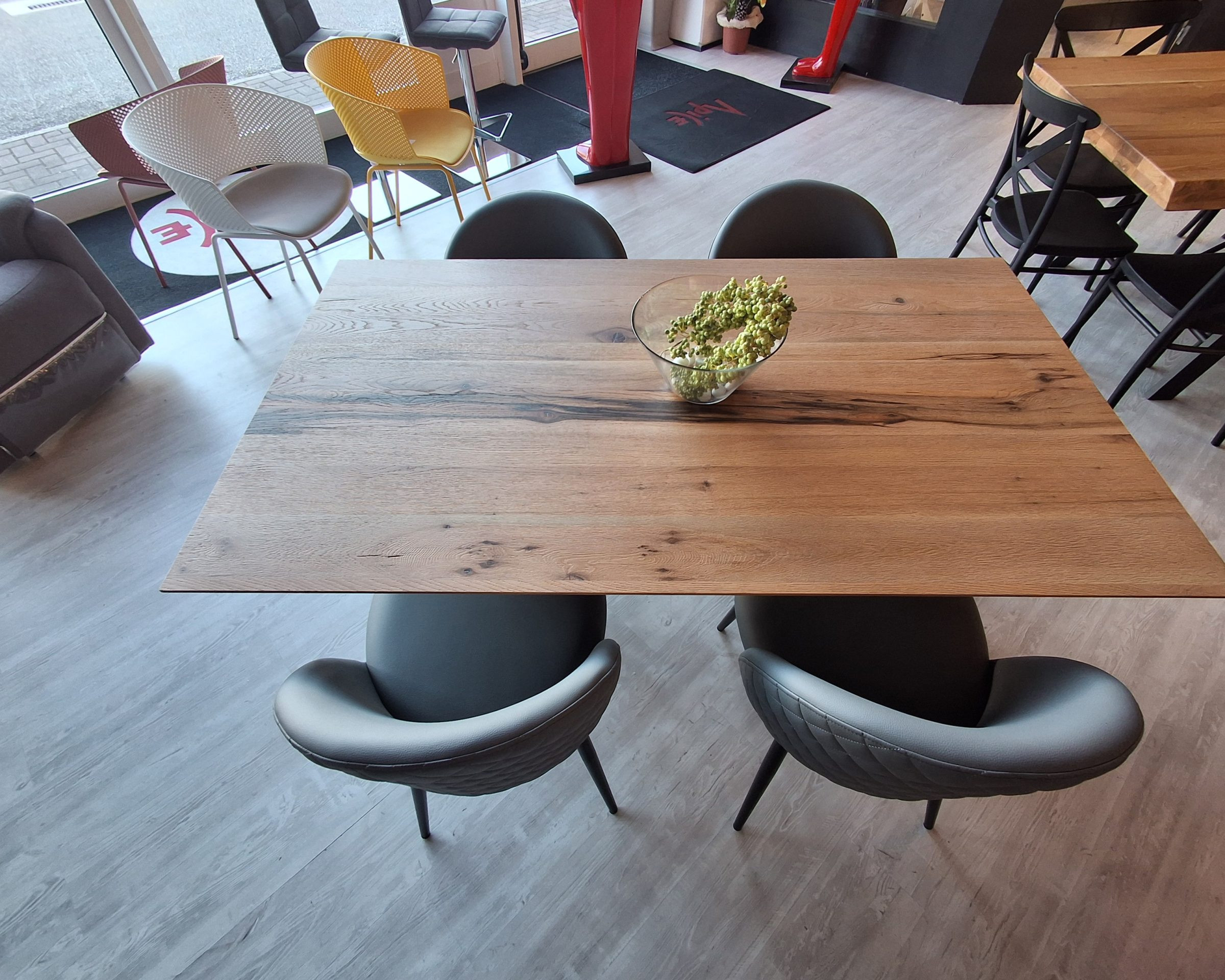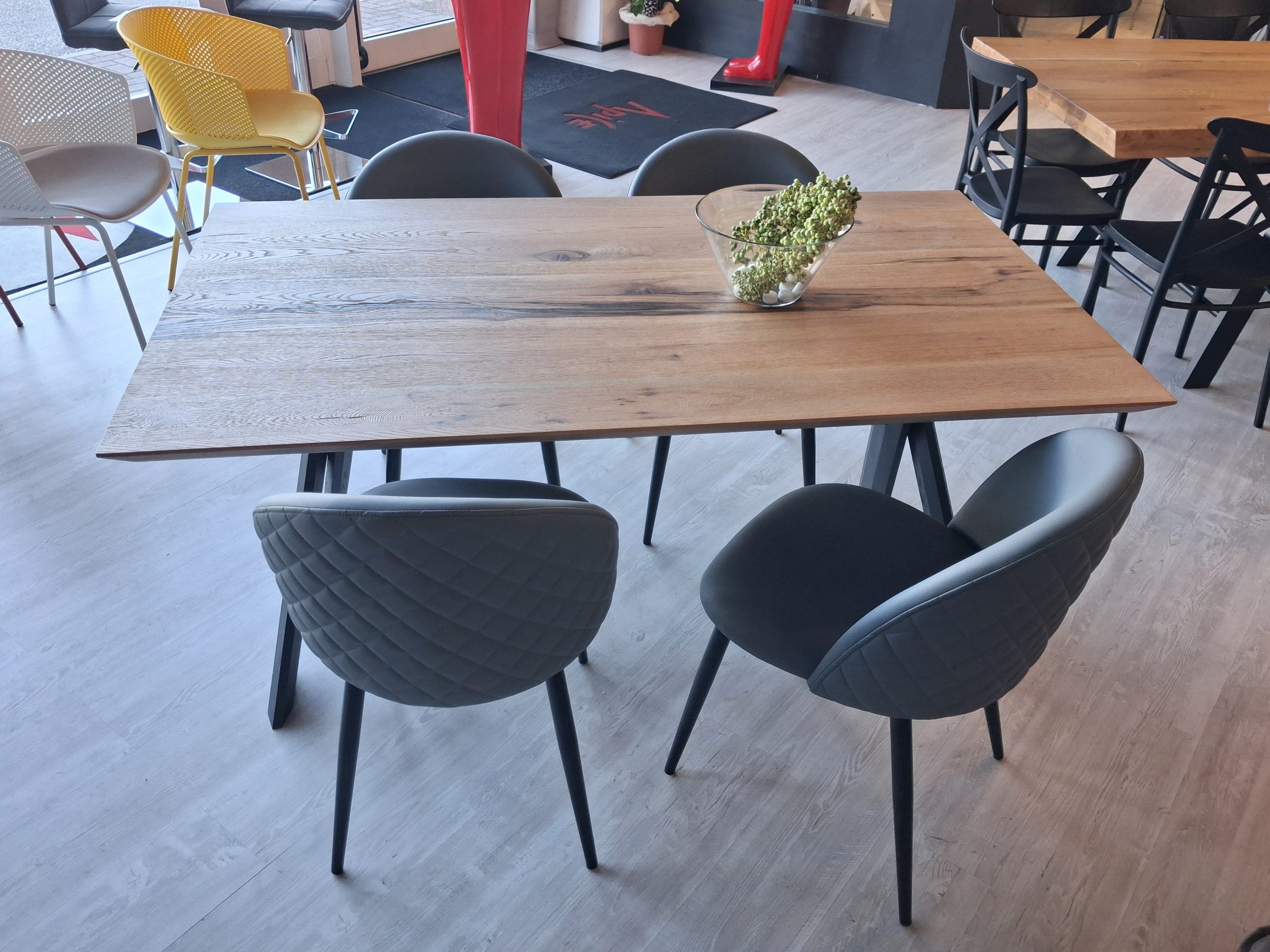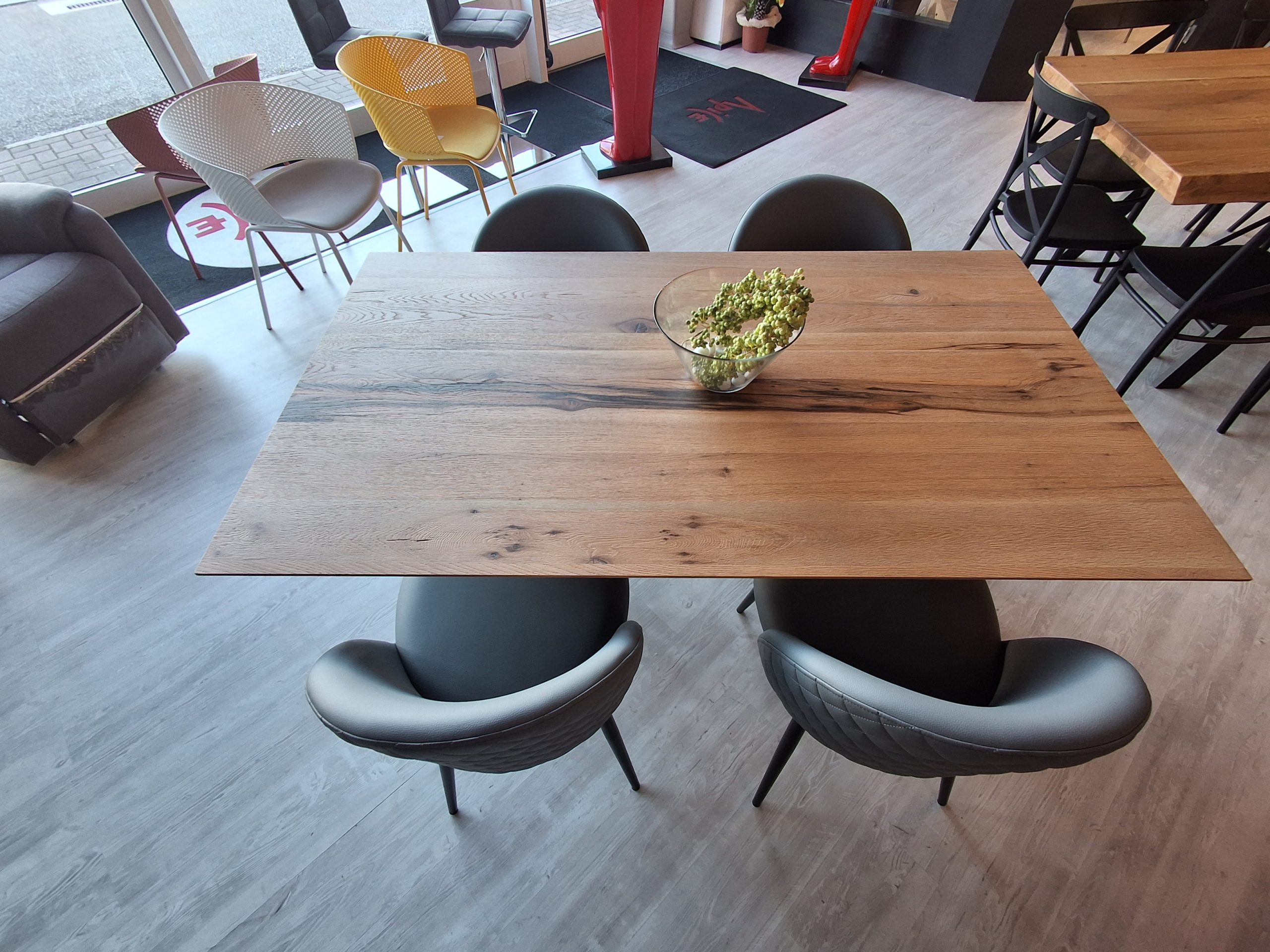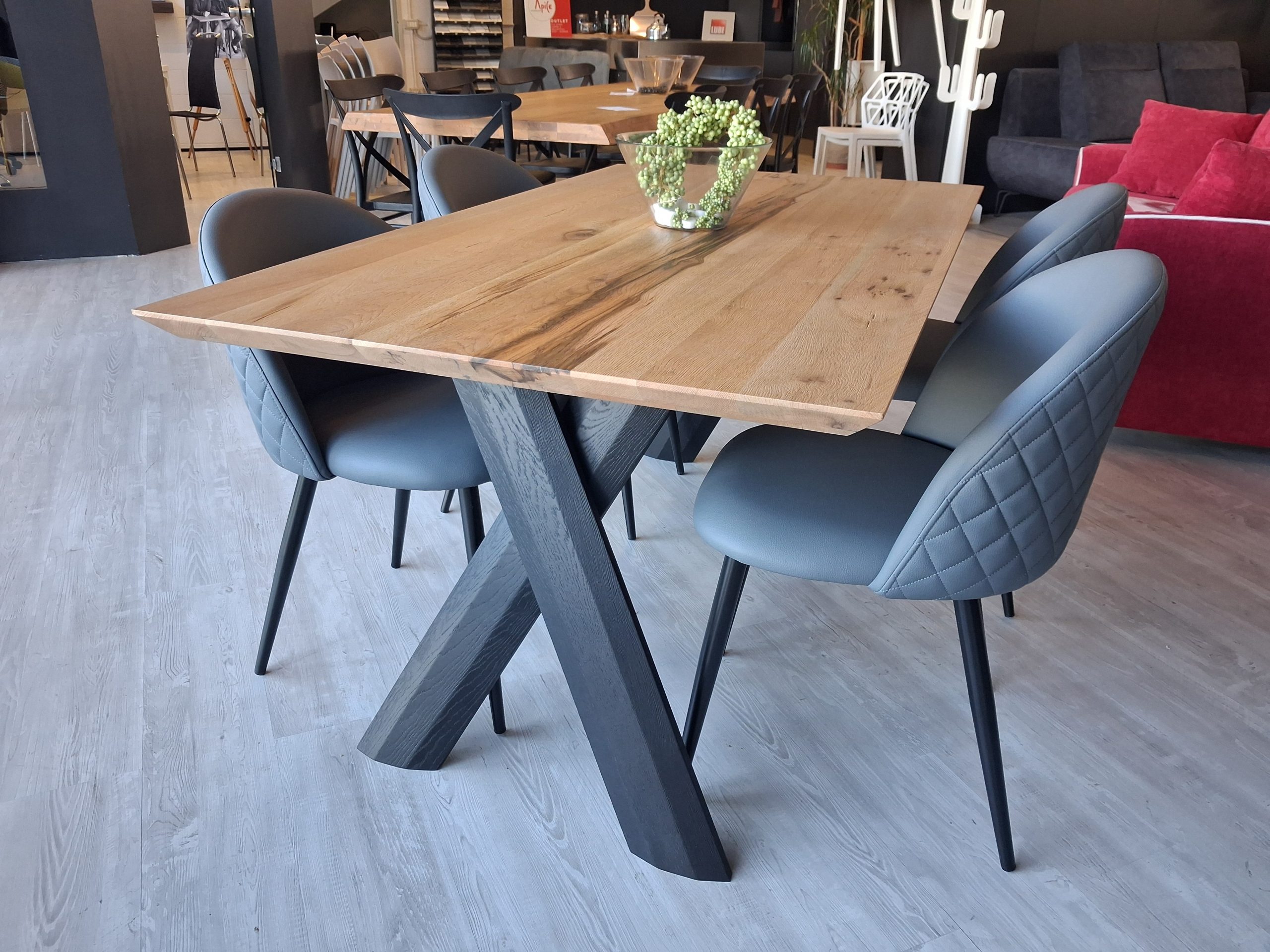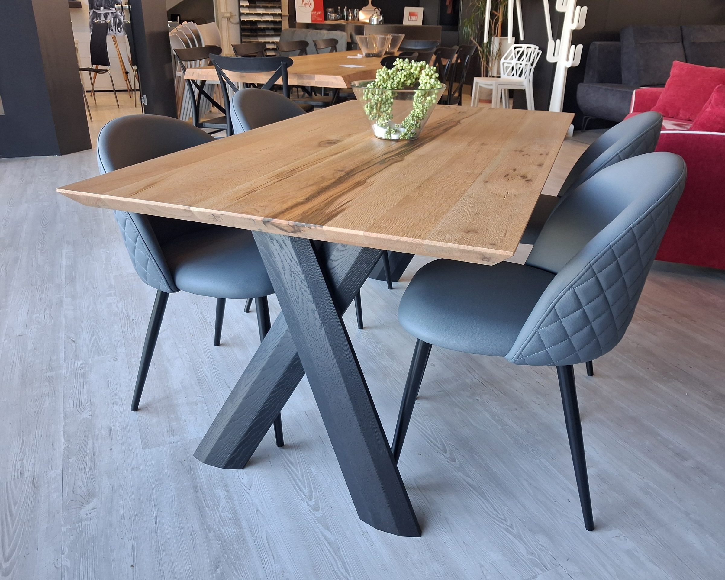 Tavolo Pechino con struttura di sostegno gambe in legno laccate nere e piano in legno di rovere invecchiato naturale.