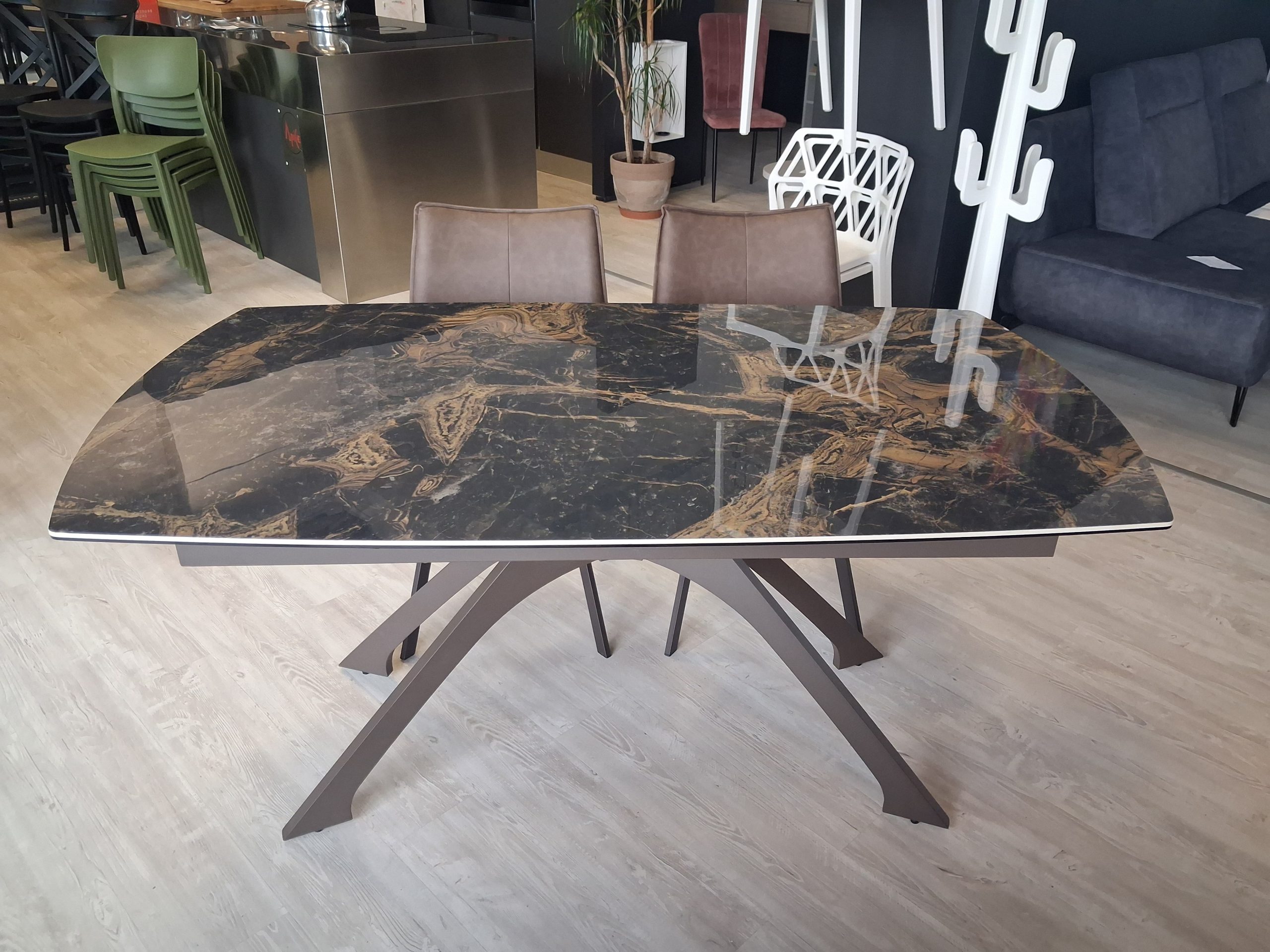 Tavolo allungabile telescopico con due allunghe laterali da 40cm; base in metallo verniciato marrone e top in grès porcellanato effetto marmo Marrone lucido.
